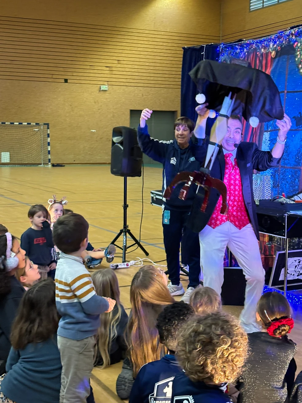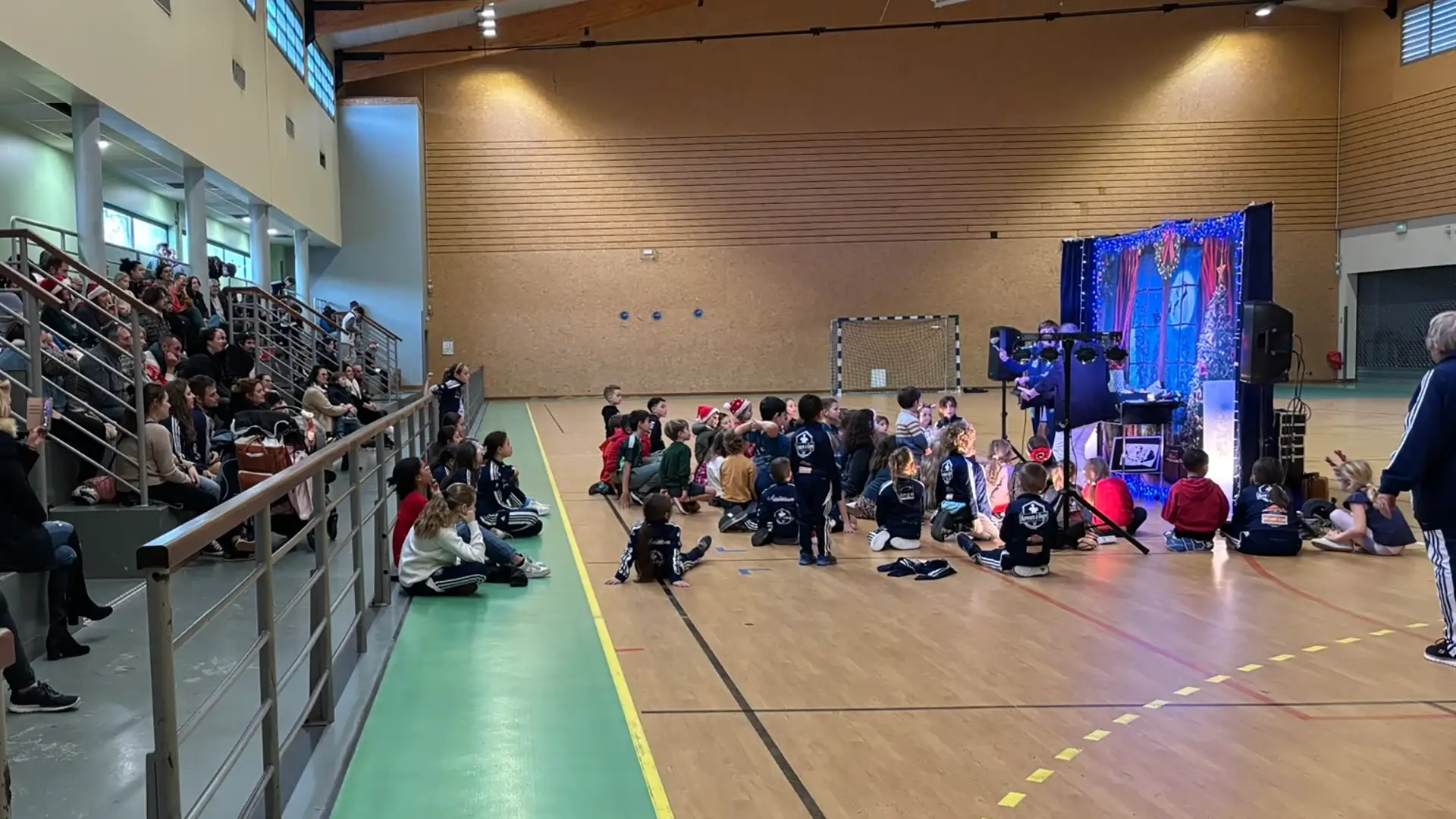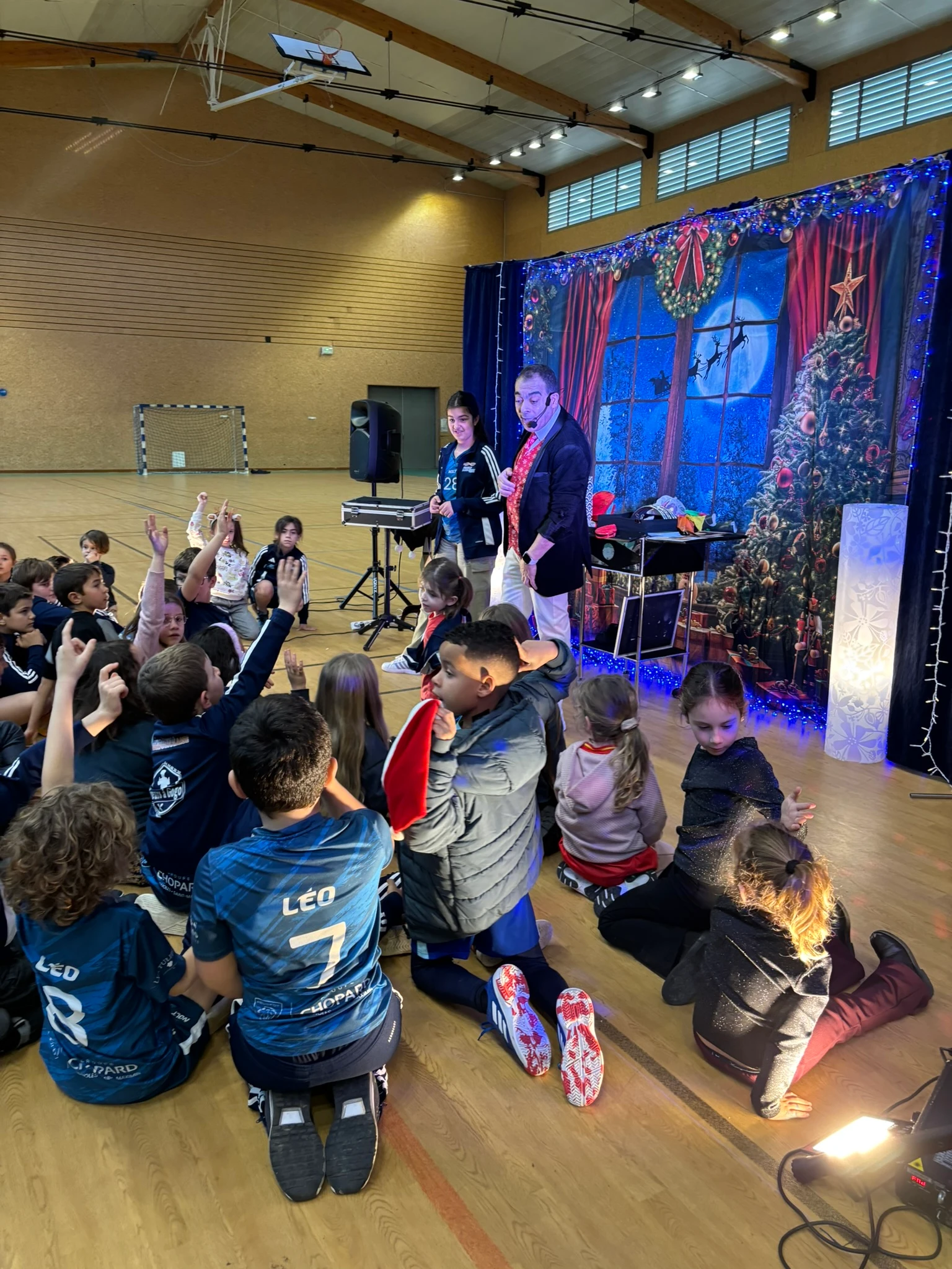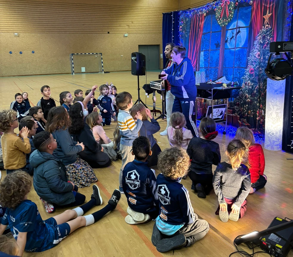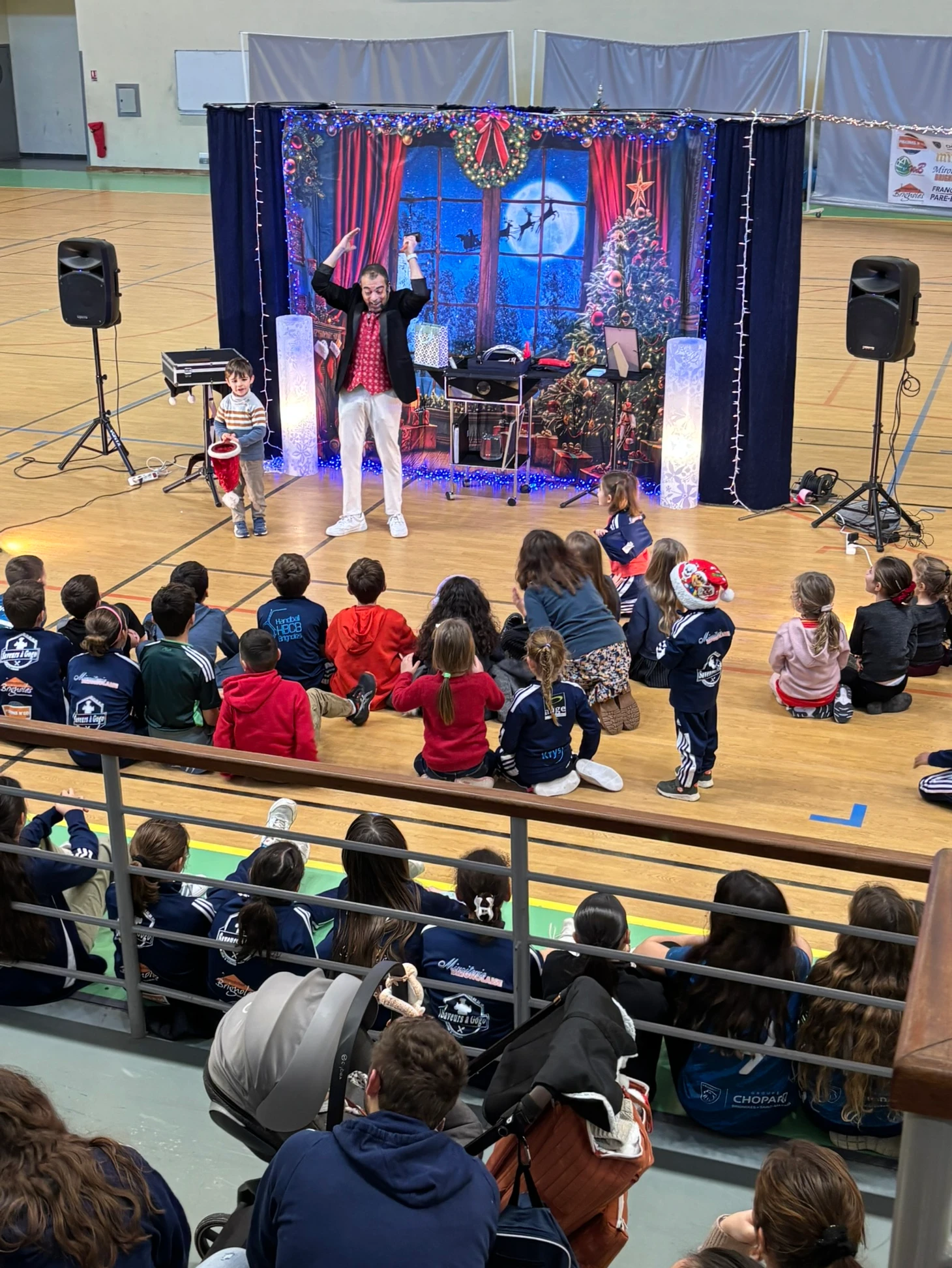 Puis vint le moment que tout le monde attendait… l’arrivée du Père Noël, dans son superbe coupé Peugeot, grâce à notre fidèle partenaire Peugeot, présent à nos côtés depuis de nombreuses années. Accueilli par des cris de joie, des chants et des sourires éclatants, le Père Noël a une nouvelle fois fait battre le cœur du gymnase