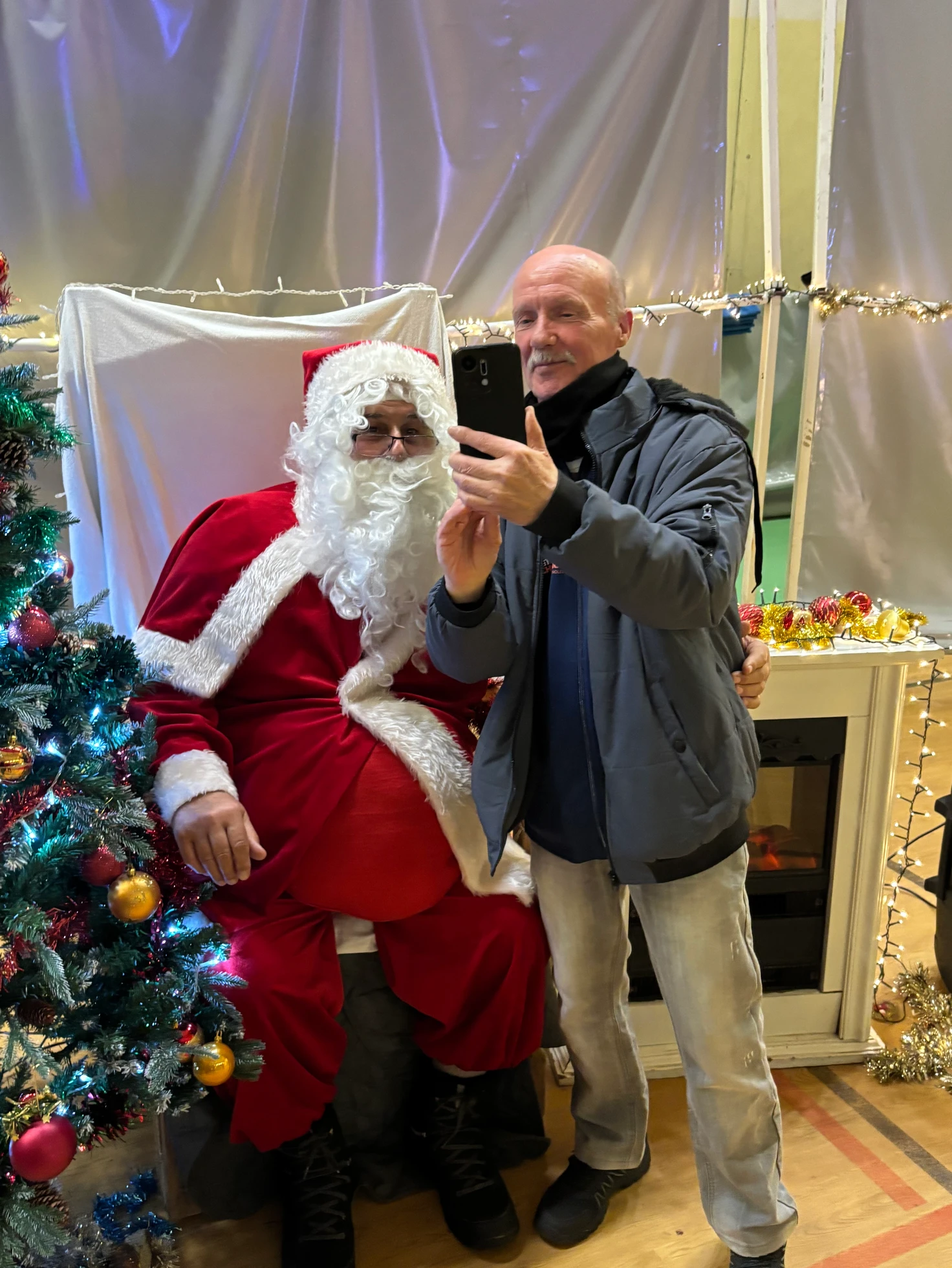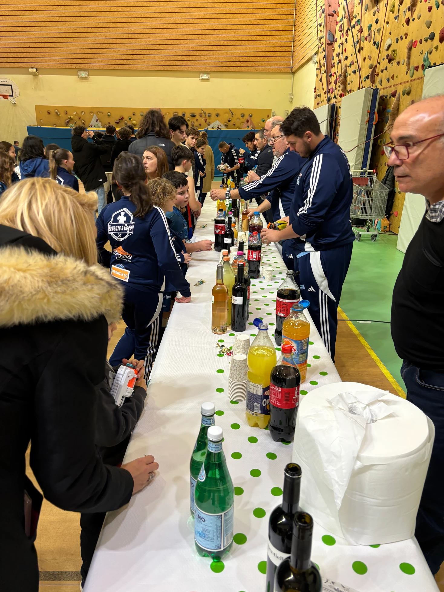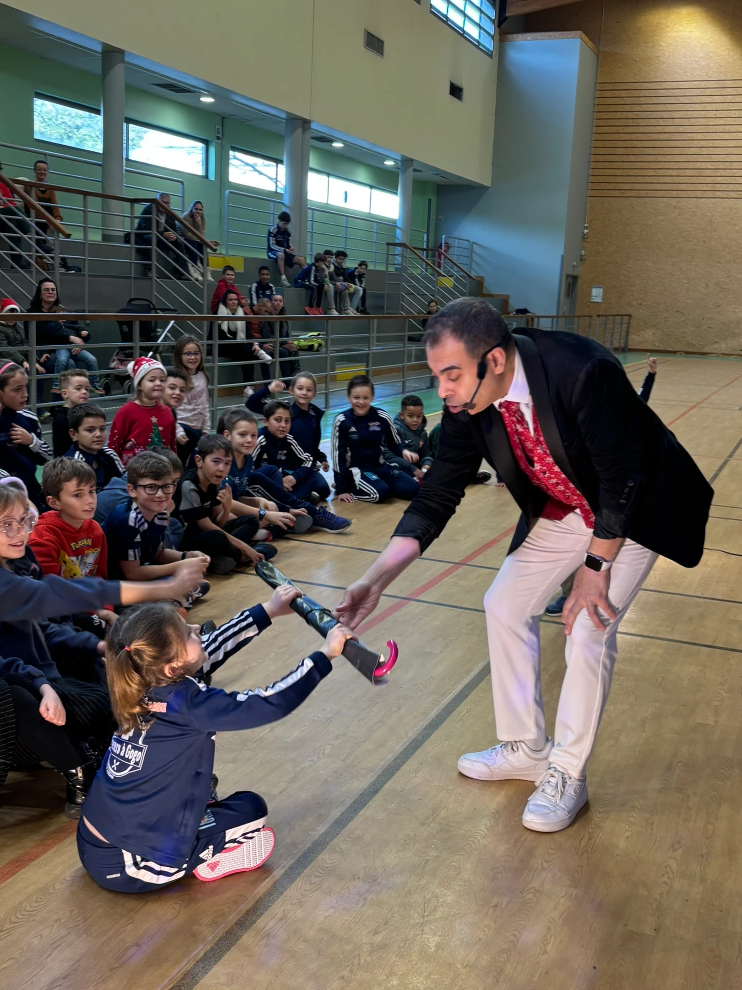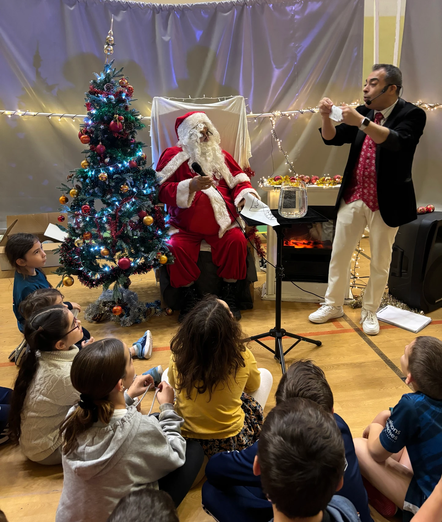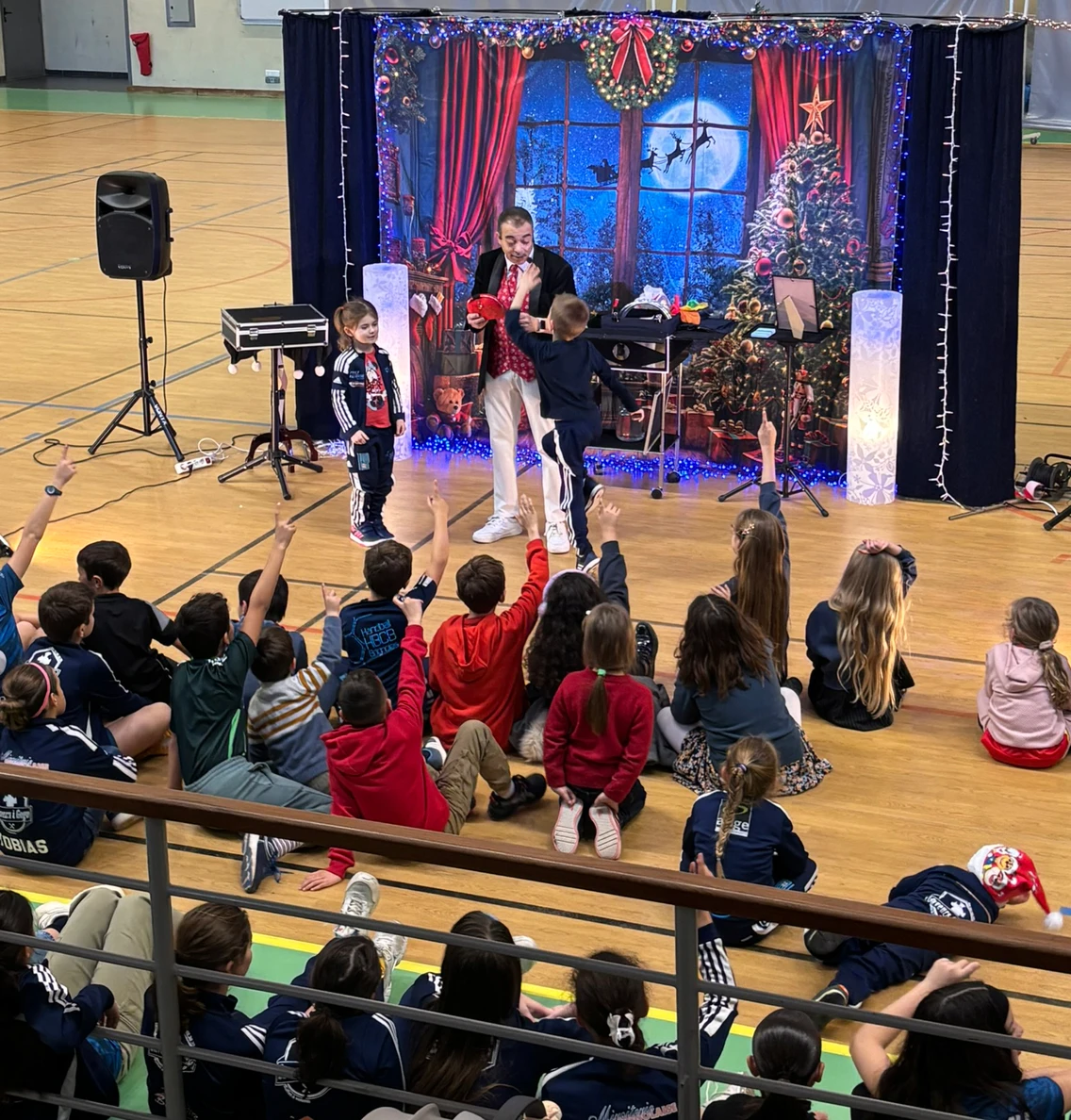 Puis vint le moment que tout le monde attendait… l’arrivée du Père Noël, dans son superbe coupé Peugeot, grâce à notre fidèle partenaire Peugeot, présent à nos côtés depuis de nombreuses années. Accueilli par des cris de joie, des chants et des sourires éclatants, le Père Noël a une nouvelle fois fait battre le cœur du gymnase